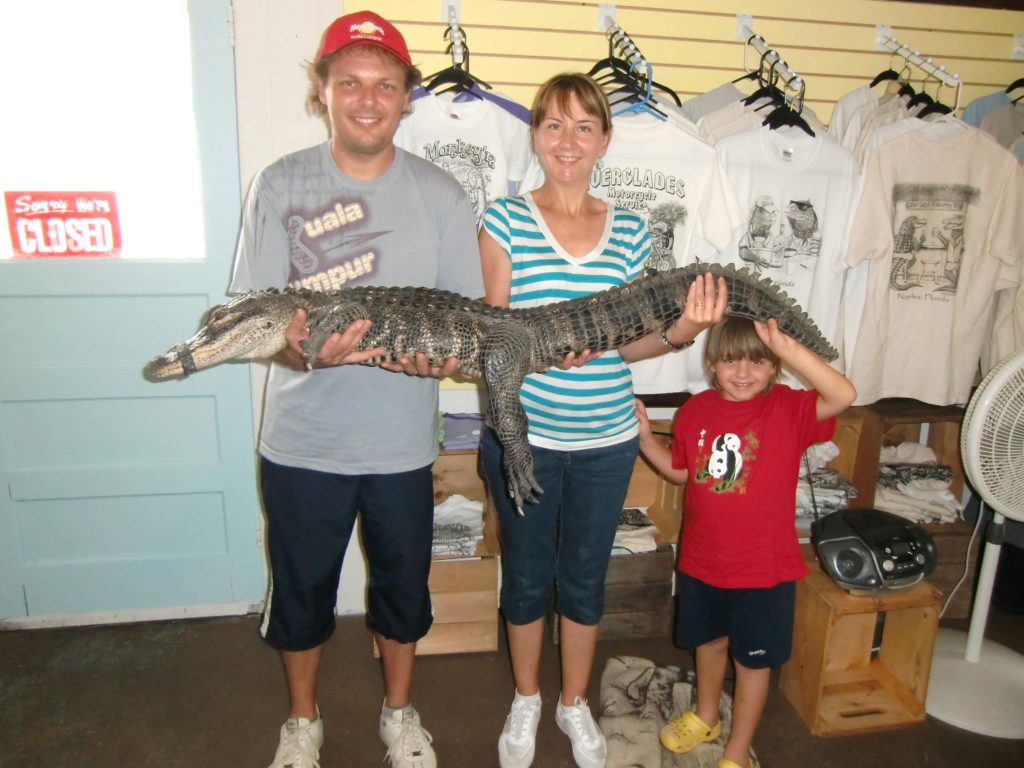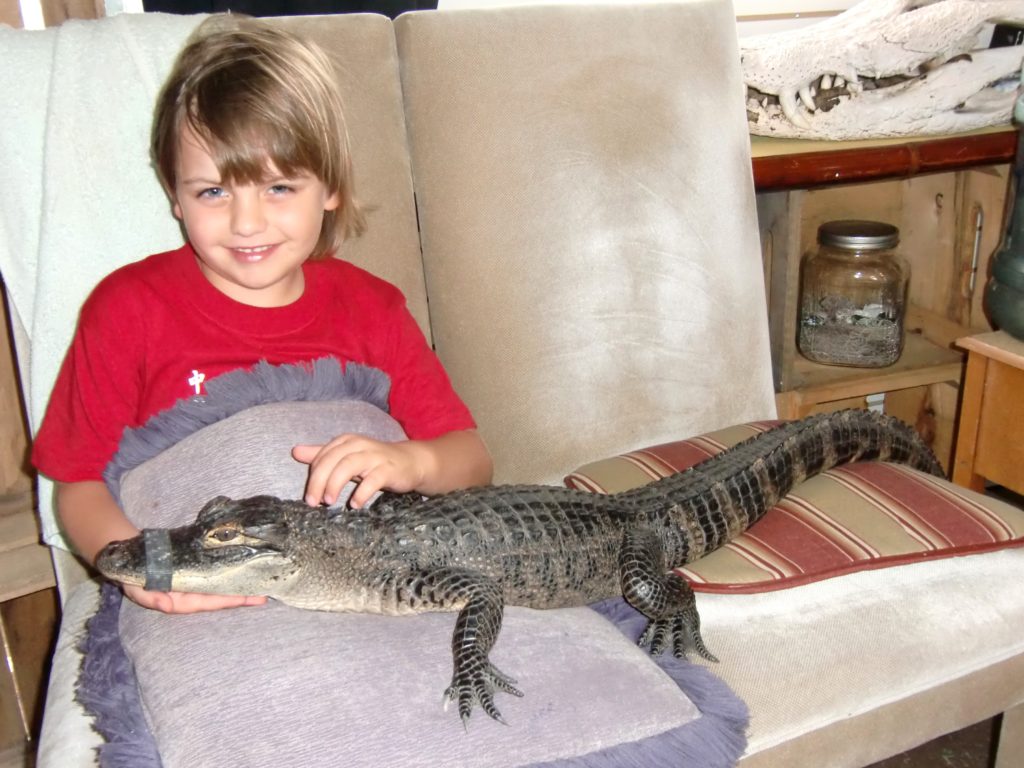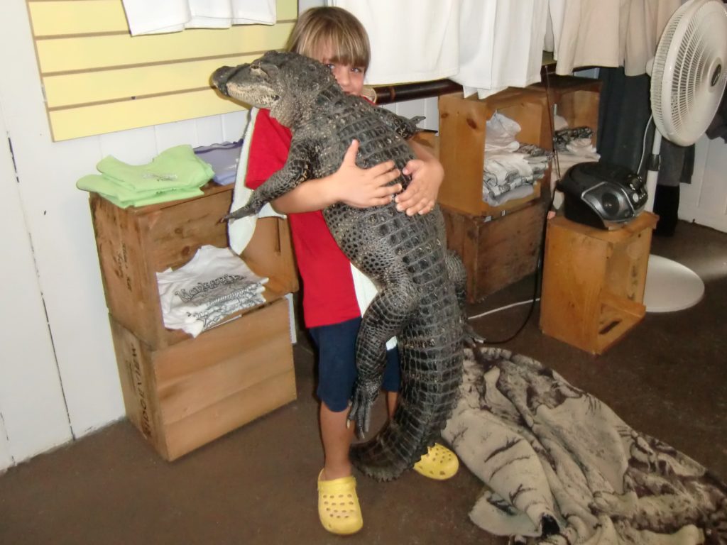 Samuele, con la sua curiosità da esploratore di sei anni, ha subito notato un piccolo chalet in legno con un’insegna che prometteva “incontri ravvicinati”. E così, senza pensarci troppo, ci siamo fermati. All’interno, tra cappellini e snack, ci aspettava un signore anziano che, con un sorriso sornione, ci ha indicato il suo compagno di lavoro: un alligatore di oltre un metro, sdraiato sotto la cassa come fosse un gatto domestico.