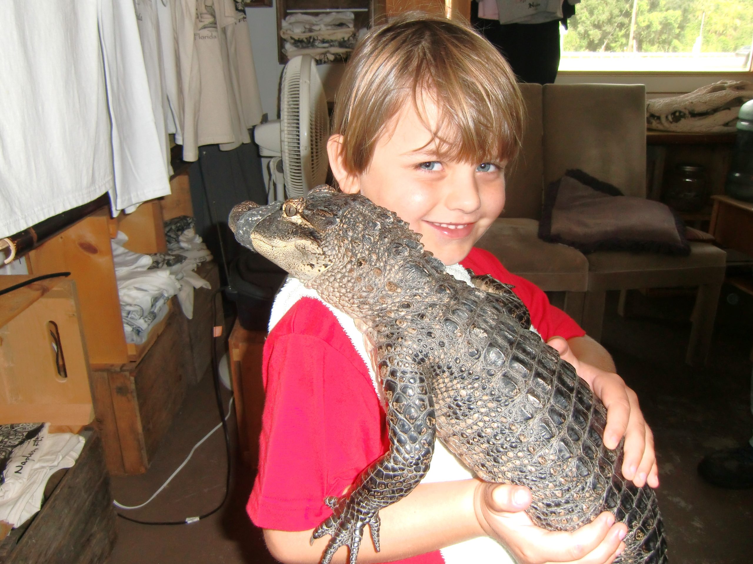 Samuele, con la sua curiosità da esploratore di sei anni, ha subito notato un piccolo chalet in legno con un’insegna che prometteva “incontri ravvicinati”. E così, senza pensarci troppo, ci siamo fermati. All’interno, tra cappellini e snack, ci aspettava un signore anziano che, con un sorriso sornione, ci ha indicato il suo compagno di lavoro: un alligatore di oltre un metro, sdraiato sotto la cassa come fosse un gatto domestico.