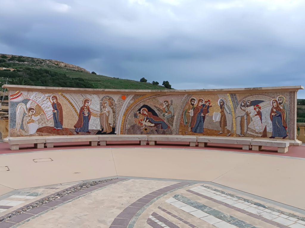 La vista dal piazzale è spettacolare: da un lato la basilica, dall’altro il paesaggio rurale di Gozo che si apre fino al mare. Un contrasto che rende Ta’ Pinu non solo un luogo di culto, ma anche un punto panoramico indimenticabile.