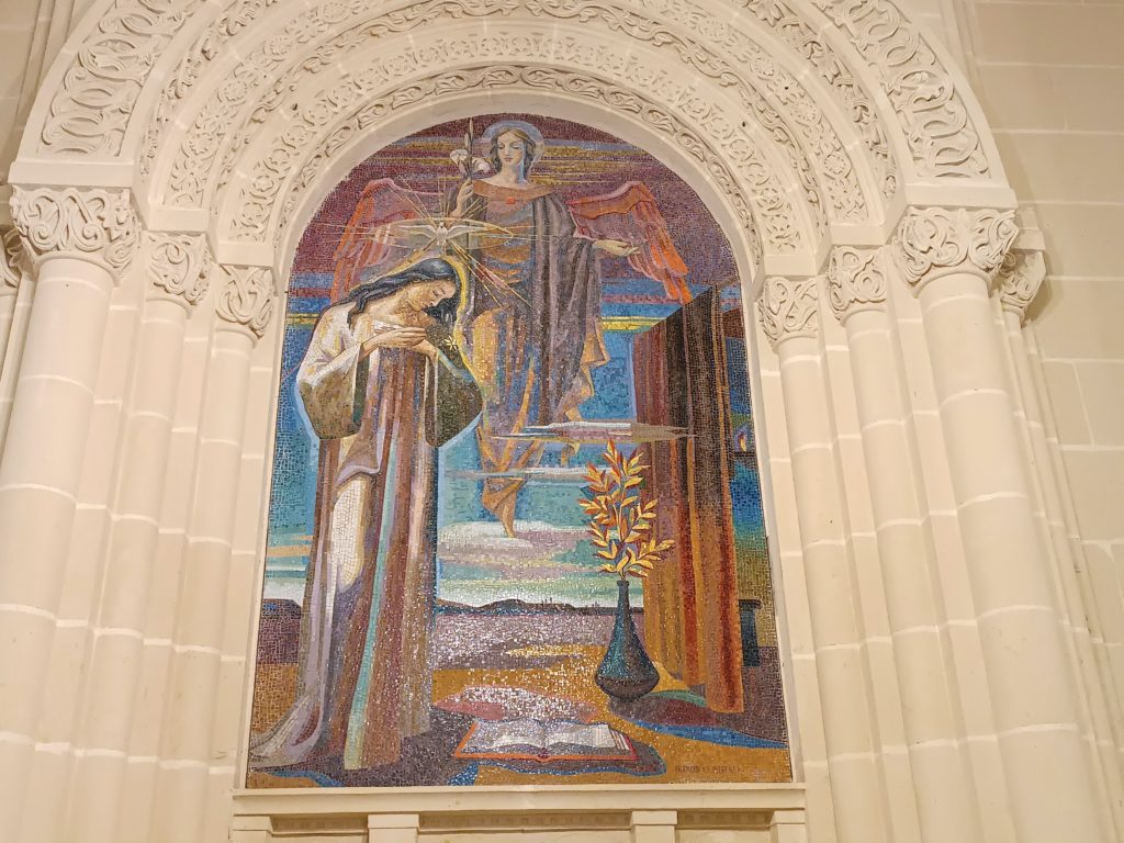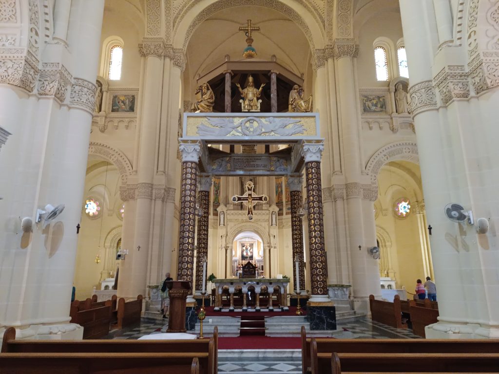 Durante il nostro giro a Gozo abbiamo deciso di fermarci al Santuario di Ta’ Pinu, una chiesa che si vede già da lontano, isolata tra i campi e le colline. La sua posizione la rende speciale: sembra quasi chiamarti a entrare. Il santuario, costruito tra il 1920 e il 1931 su progetto dell’architetto Andrea Vassallo, è in stile neoromanico e domina il paesaggio con la sua facciata elegante e il campanile che sembra vegliare sull’isola.