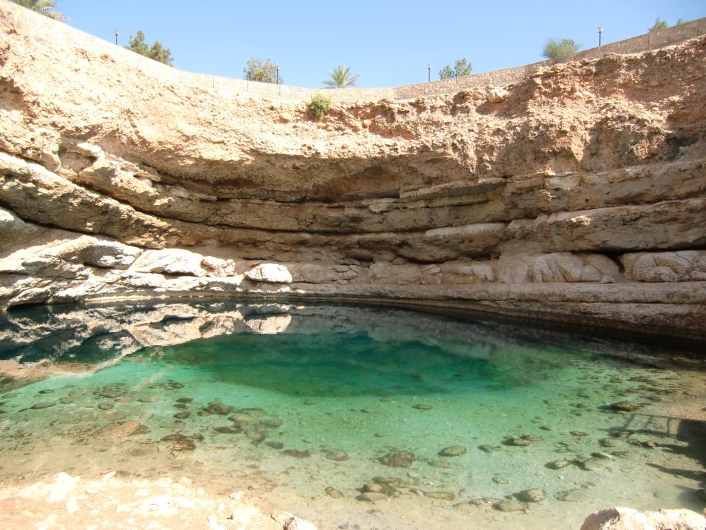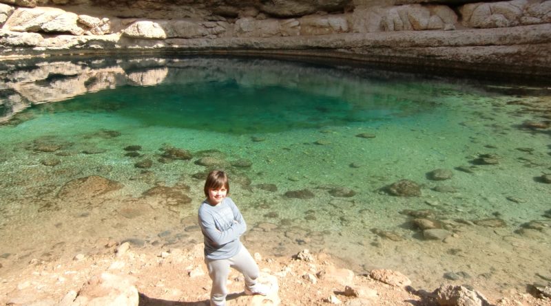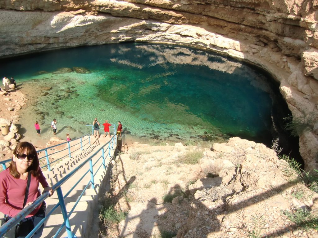Il Bimmah Sinkhole è stato il primo vero assaggio dell’Oman, e non potevamo iniziare meglio. Appena arrivati, la vista ci ha lasciati senza parole: una dolina profonda, scavata nella roccia calcarea, con l’acqua che brillava in mille sfumature di verde e azzurro. Sembrava un angolo segreto, nascosto nel deserto, eppure così vivo.